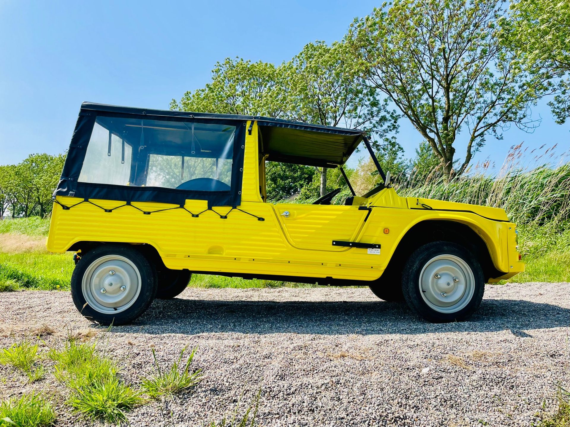 Een frisse en opvallende verschijning deze gele Mehari. We kochten hem onlangs van een echte Citroën liefhebber welke ook nog een prachtige Dyane 6 in bezit heeft. Het is een origineel NL geleverde Mehari die enkele jaren in België heeft gereden en daarna weer terug naar NL is gekomen. Voorzien van een goed onderstel en techniek. De carrosserie is wat jaren terug compleet vervangen en ziet keurig uit. Het originele dakje is helemaal netjes en compleet aanwezig en ook het interieur ziet er keurig uit. Wij leveren deze volledig rijklaar inclusief groot onderhoud.