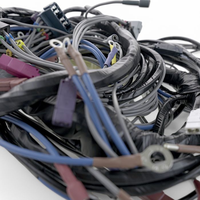 Complete elektrische kabelboom voor de voorzijde van de Méhari 4×2, geschikt voor modellen met nieuw dashboard vanaf juli 1977, vervaardigd volgens de originele specificaties.