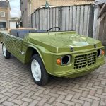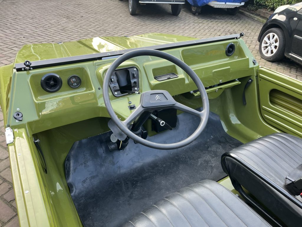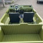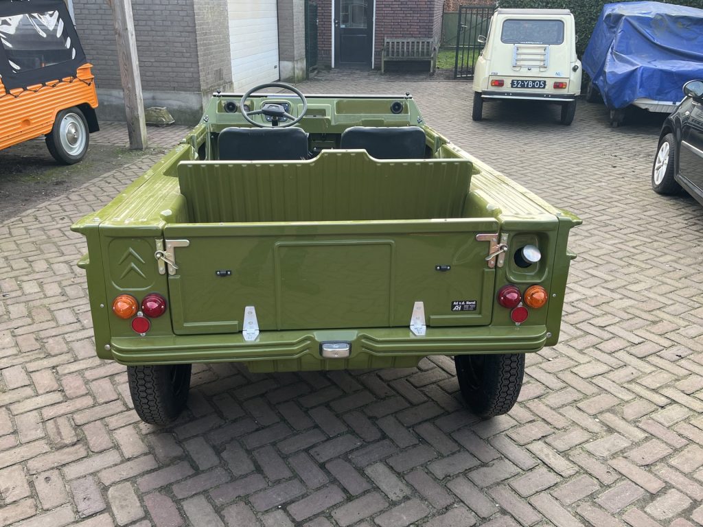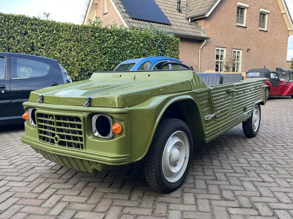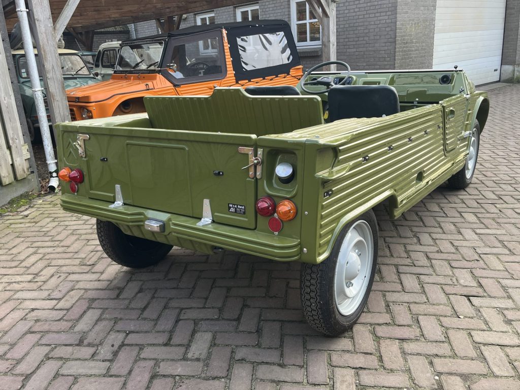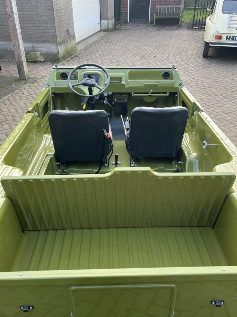 Alvast een klein voorproefje van een volledig nieuw opgebouwde Mehari in de vert montana. De complete onderzijde is verzonken en alle overige delen zijn gepoedercoat en gepassiveerd. De complete techniek is gereviseerd en ook de volledig opbouw is nieuw, carrosserie, dak, stoelen, kabelboom etc.